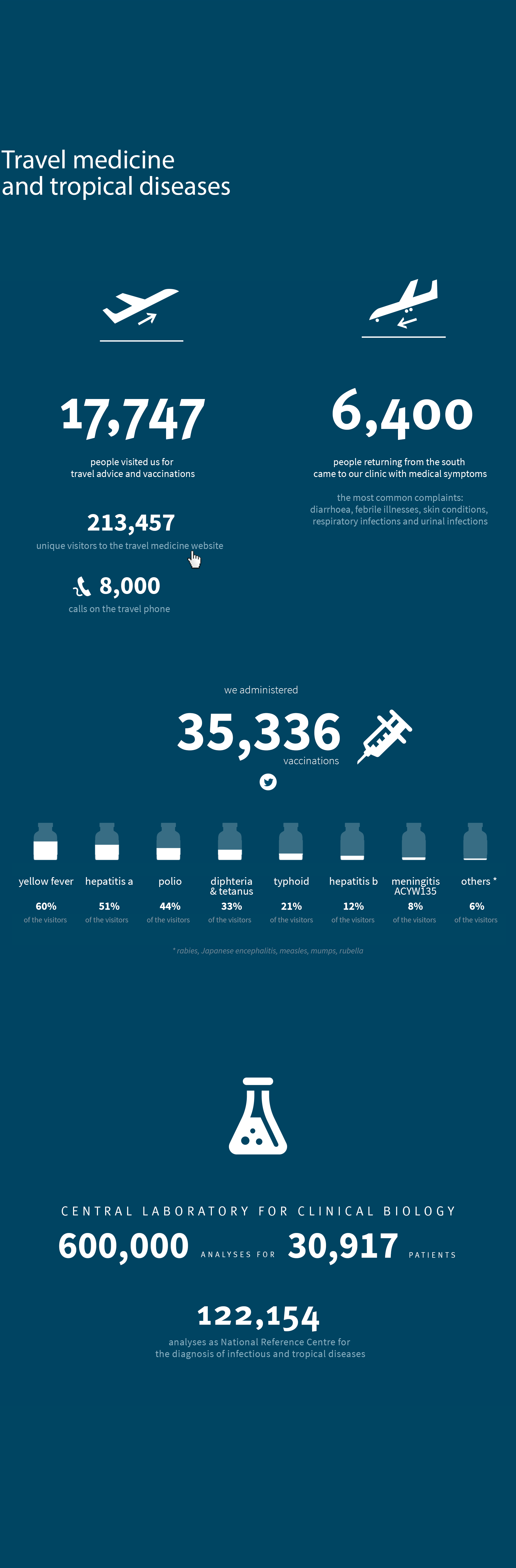 In 2013, our travel clinic in Antwerp provided advice to nearly 18.000 travellers and administered over 35.000 vaccines to prepare them for a safe journey. These routine activities are constantly underpinned by sound research. One such example is the clinical trial we conducted on a more rapid and less expensive intradermal vaccination schedule for rabies. The preliminary results are promising, which may be good news for the ‘last minute’ traveller on a low budget.