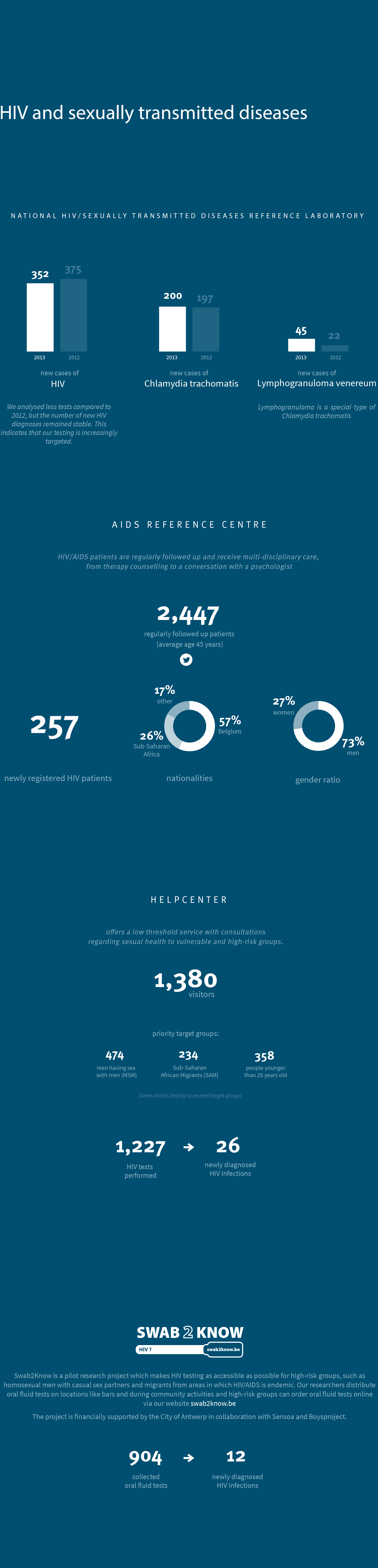 Throughout the year, our HIV/STI clinic followed up more than 2500 HIV patients, some of them belonging to the vulnerable group of illegal immigrants. We had intense debates with the relevant authorities about the need to guarantee the right to lifesaving treatment for illegal immigrants. We also played a pivotal role in developing the new national AIDS plan with Minister Onkelinx, who took notice of our arguments and case studies. Concretely, two main priorities with regard to HIV testing, established by the minister, are both already broadly applied in two of our projects. Firstly, emphasis on low-threshold HIV and STI testing centres such as ITM’s Helpcenter. Secondly, decentralised and demedicalised HIV screening such as is practiced in our pilot project Swab2Know, which uses a self-administered oral swab to detect antibodies against HIV in the saliva . This successful research project will be replicated in several European countries in the years to come.
